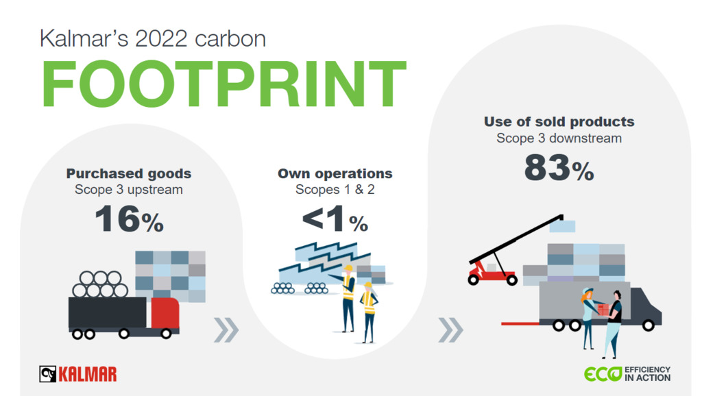 Determining the sustainability of the materials and services one sources requires measurement. We at Kalmar started by evaluating the current footprint of Kalmar suppliers (Scope 3 upstream), that of our own operations (Scopes 1 and 2), as well as the CO2 generated through use of the products we sell (Scope 3 downstream).