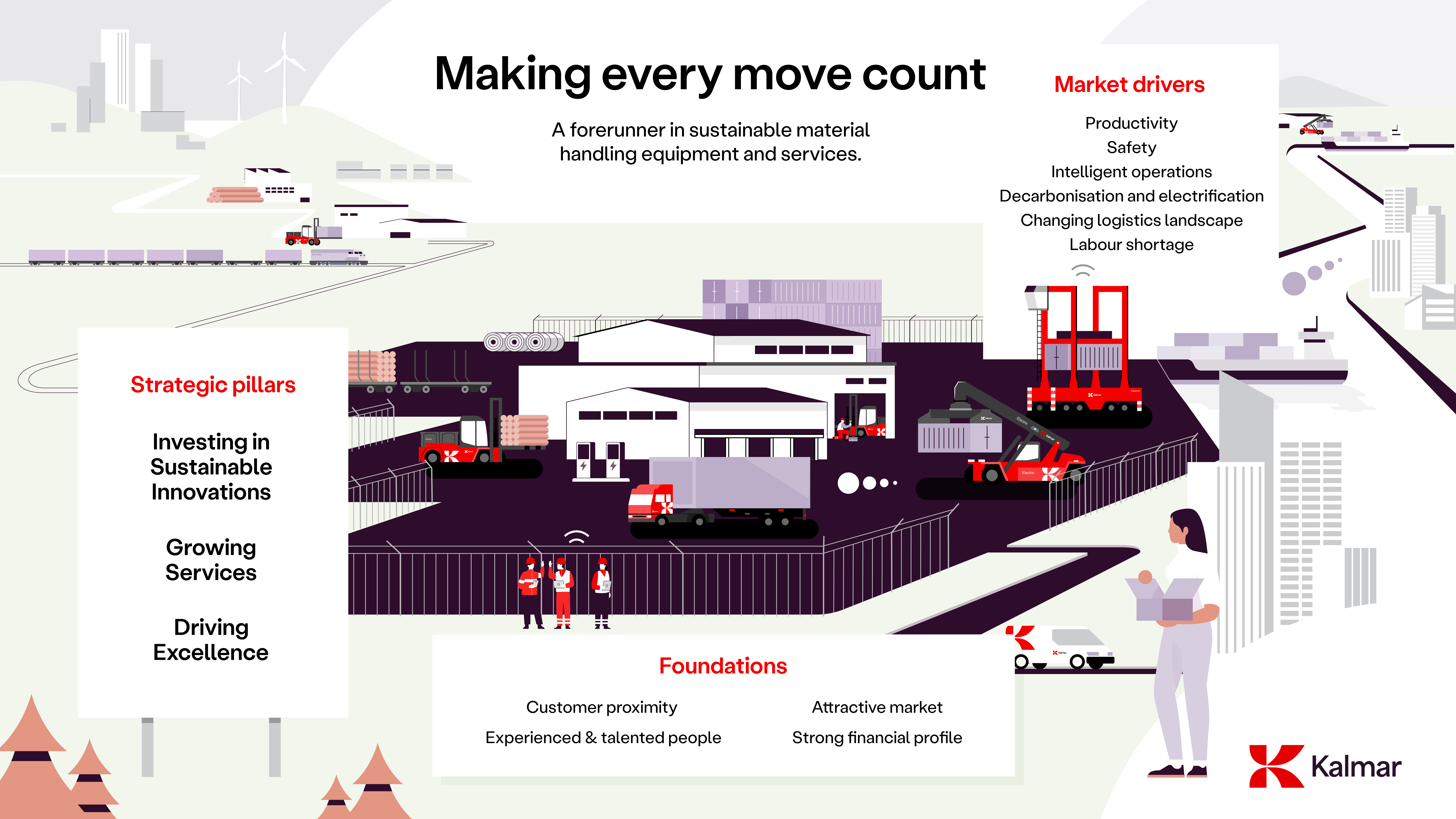 Logistikkbransjen er i ferd med å transformere seg for å møte verdens utfordringer. Hos Kalmar er vi i front av denne transformasjonen. Med vår globale rekkevidde driver vi bærekraftig materialhåndtering, skaper verdi for våre aksjonærer og hjelper kundene våre med å forbedre sikkerheten, bærekraften og produktiviteten deres. Sammen gjør vi hver bevegelse betydningsfull.